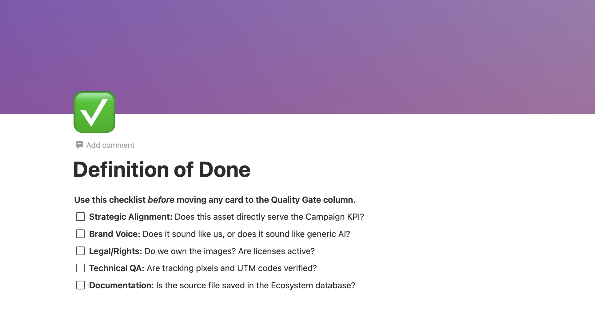 ✅ Definition of Done Checklist: A five-point quality assurance (QA) protocol built directly into the system. Before anything ships, it clears five gates: Strategic Alignment, Brand Voice, Legal/Rights, Technical QA, and Documentation.