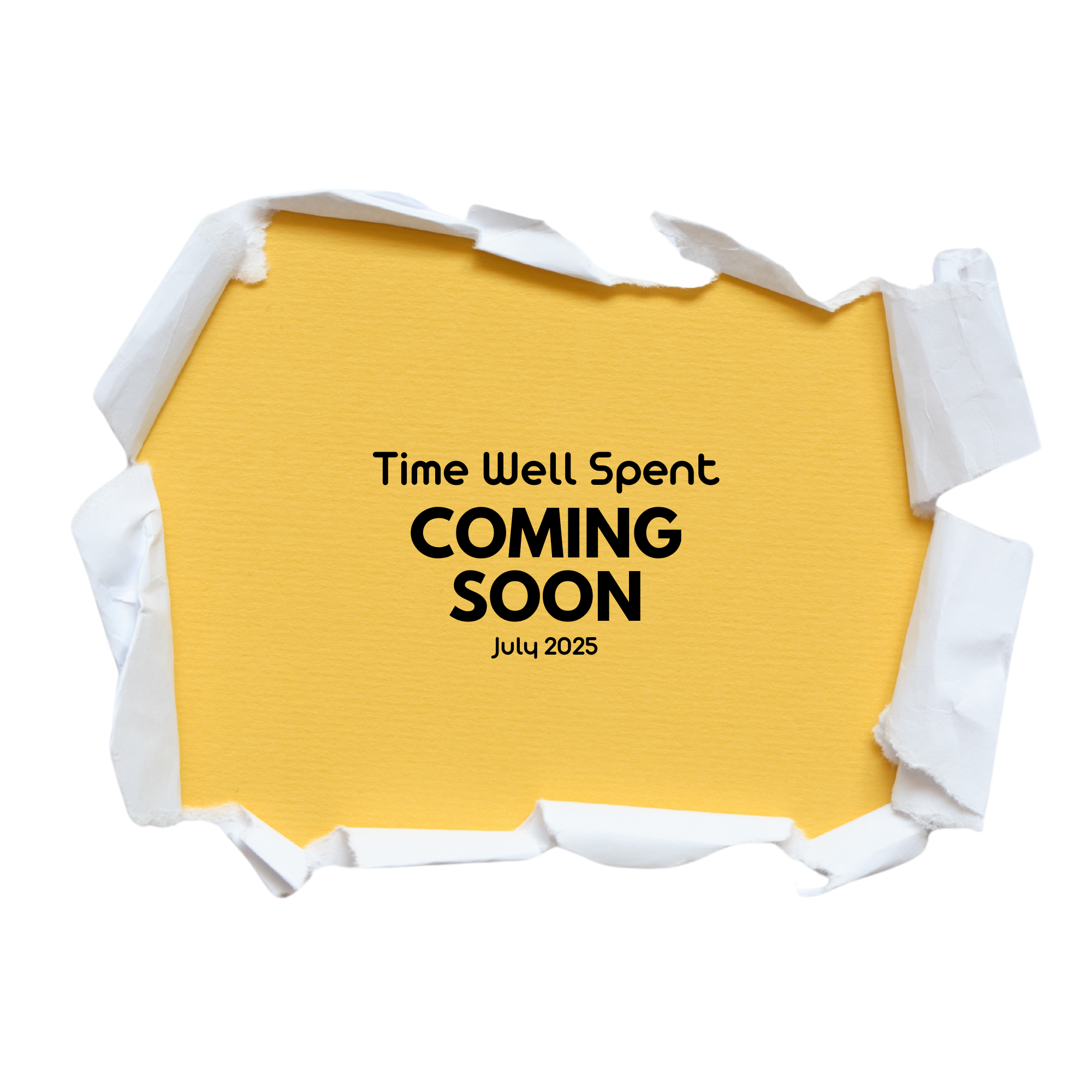 Torn yellow paper with a message that reads, 'Time Well Spent Coming Soon July 2025,' surrounded by torn white paper.