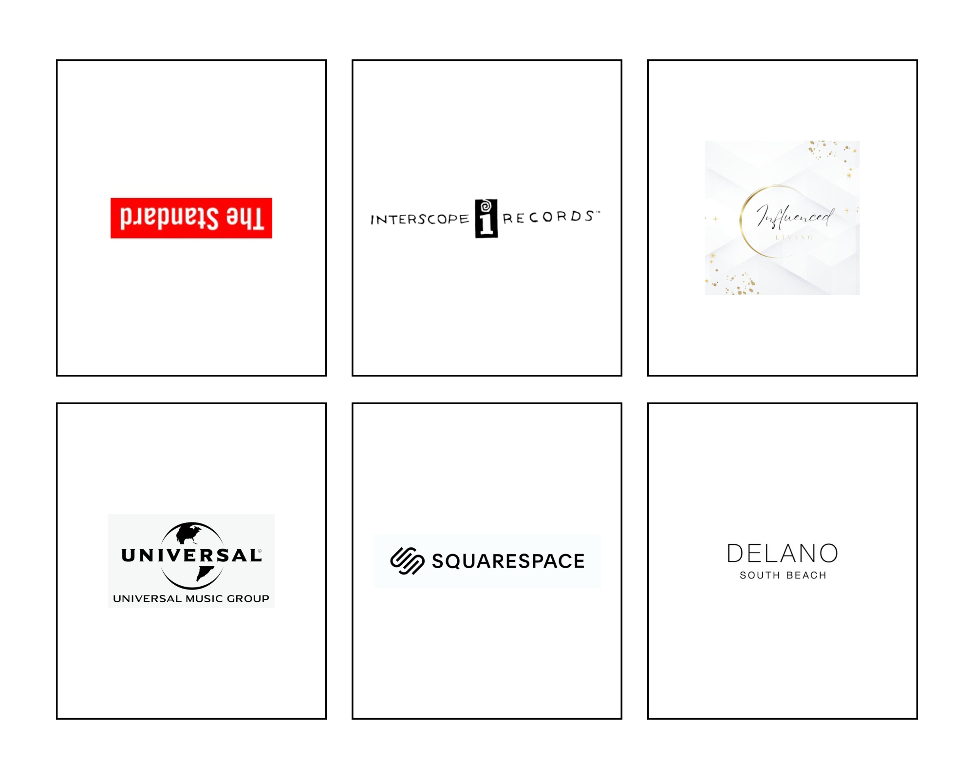 A grid of six music and entertainment company logos, including The Strand, Interscope Records, Influenced Living, Universal Music Group, Squarespace, and Delano South Beach.