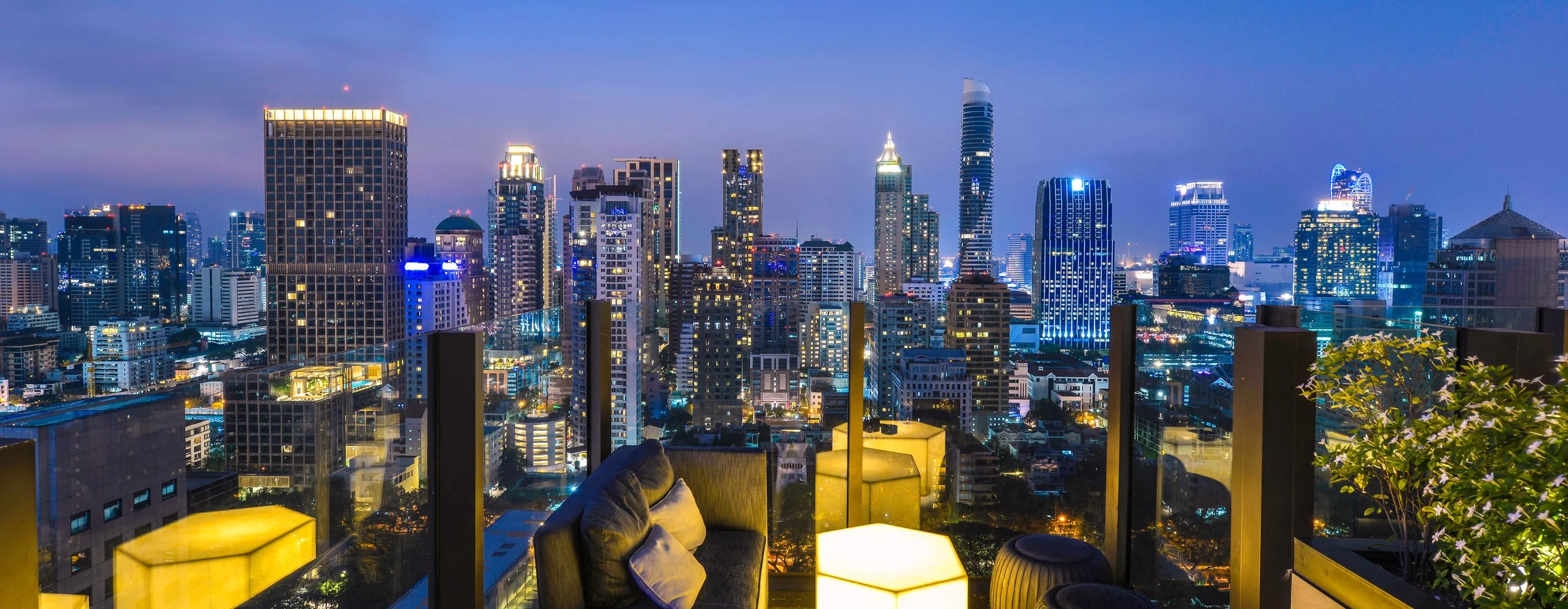 Nighttime city skyline with illuminated skyscrapers, seen from a balcony with outdoor seating and garden.